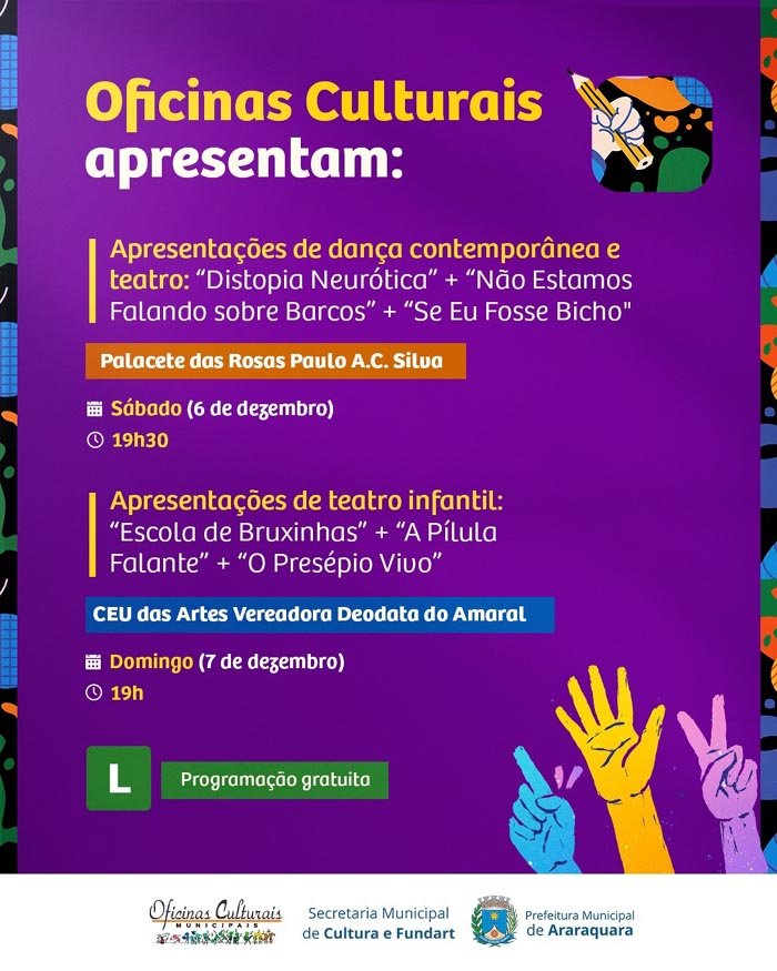 Sábado e domingo, 6 e 7 de dezembro, têm diversas apresentações artísticas gratuitas com os alunos do programa Oficinas Culturais Municipais.