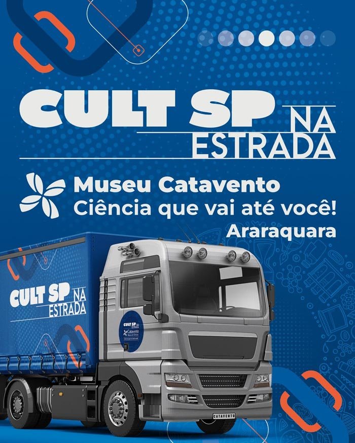 Na próxima segunda-feira, 05 de janeiro, o Museu Catavento, instituição da Secretaria da Cultura, Economia e Indústria Criativas do Estado de São Paulo, chegará na cidade de Araraquara com o projeto “Museu Catavento: Ciência que vai até você”, que integra o programa CultSP na Estrada, voltado à promoção e circulação de projetos culturais em diversas regiões do estado, ampliando o acesso à cultura e ao conhecimento. Com esta proposta, o Catavento idealizou uma carreta de 60 metros quadrados de área expositiva que é um museu itinerante, com experiências científicas interativas e oficinas educativas gratuitas que começou a percorrer o estado no início de setembro de 2025. A carreta do Museu Catavento abre para visitação na cidade a partir das 8h30 da segunda-feira, dia 05. O museu itinerante prevê passar por 39 cidades ao todo, até março de 2026, e estima-se que mais de 10 mil pessoas sejam impactadas mensalmente pelo projeto (ver serviço completo abaixo com a relação de cidades a serem visitadas).