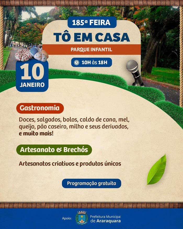 Neste sábado, 10 de janeiro, o Parque Infantil recebe mais uma edição da Feira “Tô em Casa”, das 10h às 18h, em uma realização do Coletivo Tô em Casa, com apoio da Prefeitura de Araraquara por meio da Secretaria Municipal de Desenvolvimento Econômico, via Subsecretaria do Trabalho e da Economia Criativa e Solidária.
