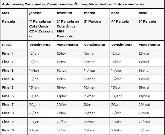 Assim como no ano passado, a fim de facilitar o pagamento do contribuinte que opta pelo parcelamento do tributo, a Sefaz-SP definiu todos os vencimentos no mesmo dia do mês – a placa 1, por exemplo, tem vencimento em 12 de janeiro, 12 de fevereiro, 12 de março, 12 de abril e 12 de maio. Caso o vencimento ocorra em finais de semana ou feriados, o pagamento poderá ser feito no próximo dia útil.