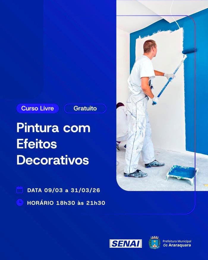 A Prefeitura de Araraquara, em parceria com o Serviço Nacional de Aprendizagem Industrial, está com inscrições abertas para o curso gratuito de Pintura com Efeitos Decorativos, com carga horária de 40 horas.