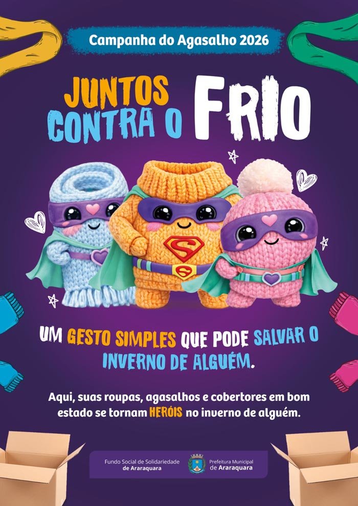 O Fundo Social de Solidariedade de Araraquara fará o lançamento oficial da Campanha do Agasalho 2026 nesta quinta-feira (9). Com o tema "Juntos Contra o Frio", a ação pretende mobilizar a cidade num movimento de solidariedade em favor de quem mais precisa neste inverno. Serão 76 pontos de arrecadação espalhados pelo município, incluindo supermercados, lojas, farmácias e instituições de ensino.