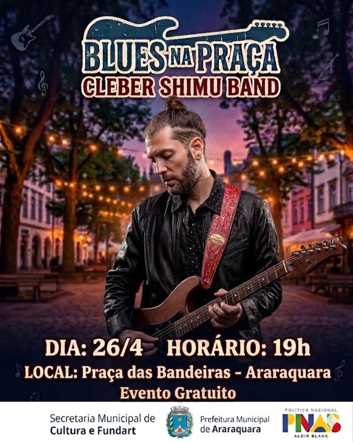 O blues toma conta da Praça das Bandeiras neste domingo (26), com a apresentação do projeto “Blues na Praça”, com Cleber Shimu Band, das 19h às 20h30. O projeto é um dos selecionados pela Lei Aldir Blanc, executada em Araraquara pela Secretaria Municipal de Cultura e Fundart, com foco no fortalecimento da cena artística e no acesso ampliado à música.