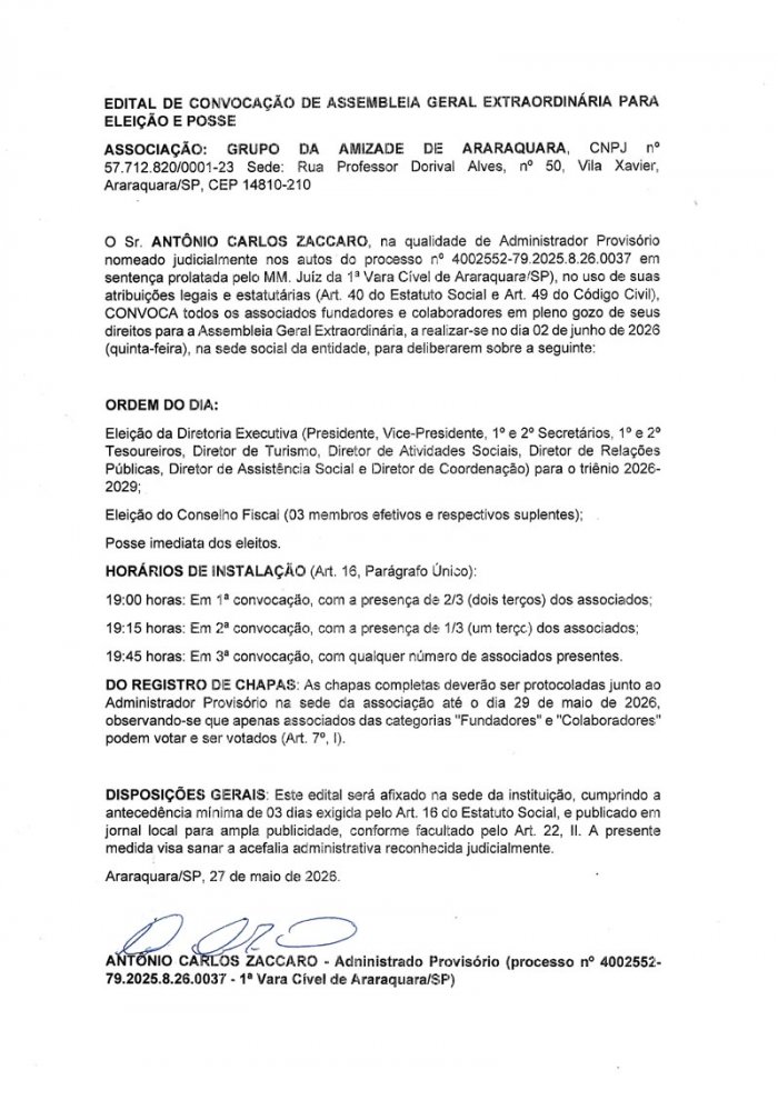 Edital de Convocação: Associação Grupo da Amizade de Araraquara