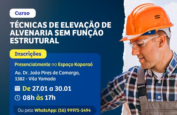 Formação gratuita capacita profissionais para execução de alvenaria sem função estrutural; aulas começam no dia 2 de fevereiro no Espaço Kaparaó