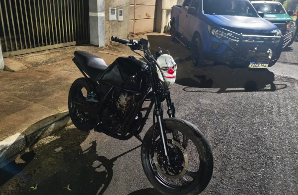 Veículo estava com chassi suprimido, ligação direta e era conduzido por menor com passagens por roubo e tráfico. Ruído do motor simulava disparos de arma de fogo.