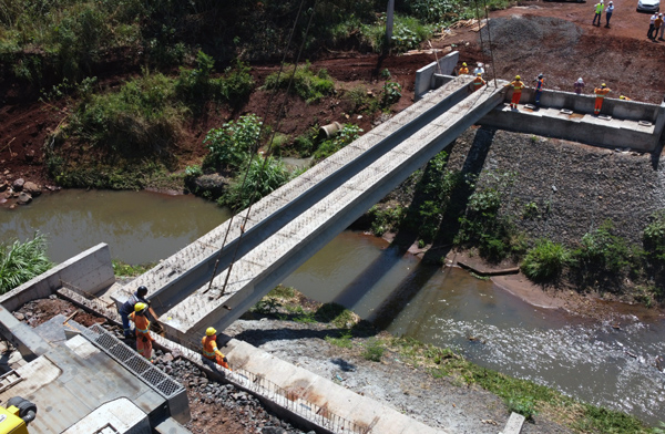 No local, um guindaste opera na içagem das sete vigas estruturais, com 35 toneladas cada, que servirão de suporte para as pré-lajes