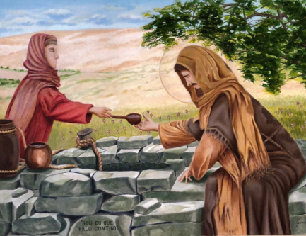 Sou eu que falo contigo- Passagem do Evangelho de São João onde Jesus encontra uma mulher samaritana próximo a cidade de e Ele pede água pra ela que por sua vez o serve com a bebida. A palavra chave dessa pintura