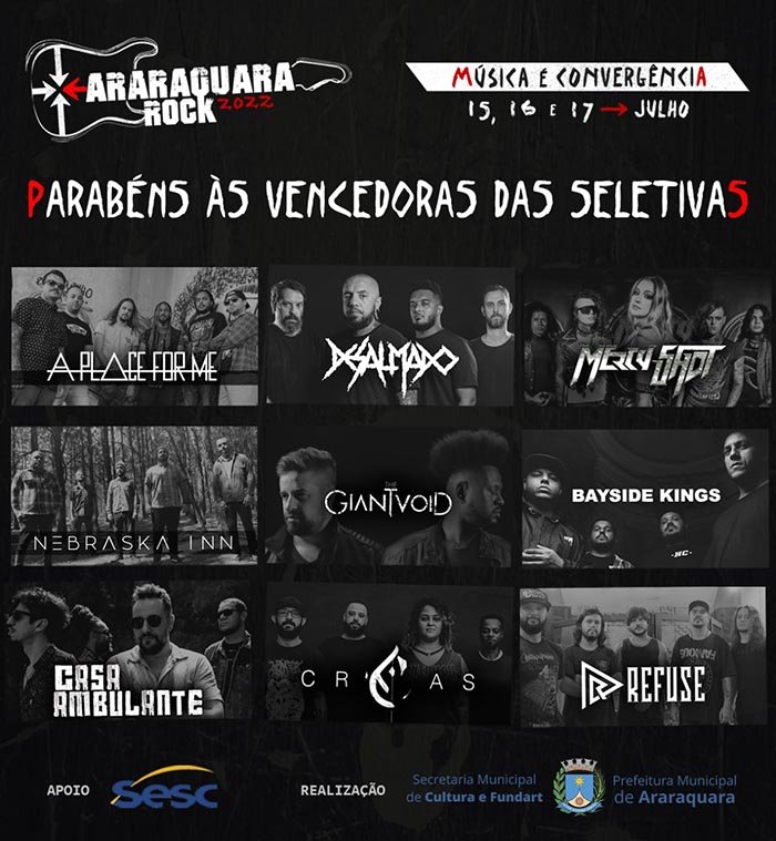 A organização da 20ª edição do Araraquara Rock divulgou as 9 bandas selecionadas pela comissão de seleção. Este ano o festival registrou recorde com 336 bandas inscritas, consolidado como um dos principais festivais de música do país voltados ao cenário independente, além de ser ferramenta fundamental de difusão cultural na cidade.