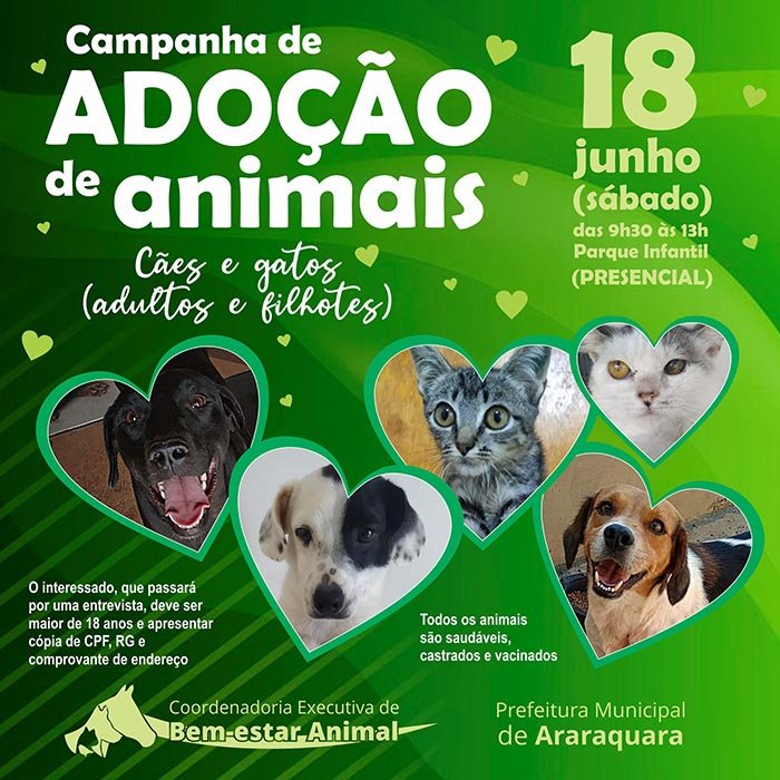 Neste sábado, 18 de junho, das 9h30 às 13 horas, será realizada a Campanha de Adoção de Animais no Centro de Adoção Permanente Cão Gabriel, localizado no Parque Infantil. A campanha é realizada pela Prefeitura de Araraquara por meio da Coordenadoria de Bem-Estar Animal da Chefia de Gabinete.