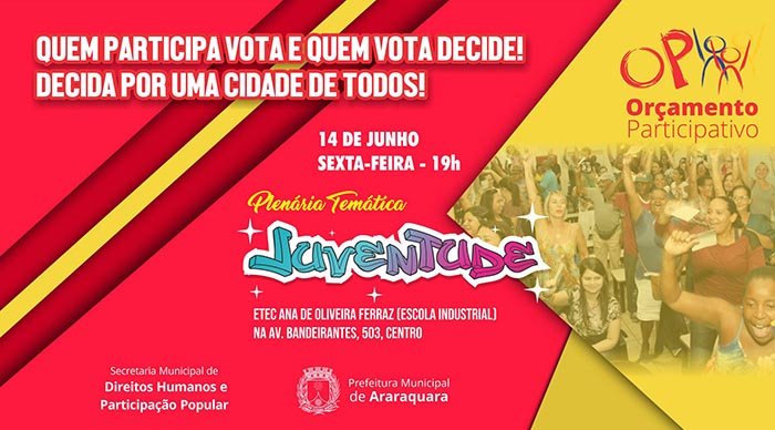 O encontro, que tem participação aberta a toda a população, definirá a obra ou programa que será executado com foco no público jovem de Araraquara. Essa será a terceira plenária temática do OP 2022. As plenárias temáticas envolvem sete públicos específicos, divididos em Mulheres, População Negra, Pessoa com Deficiência, Juventude, Idosos, LGBTQIA+ e Plenária da Cidade.