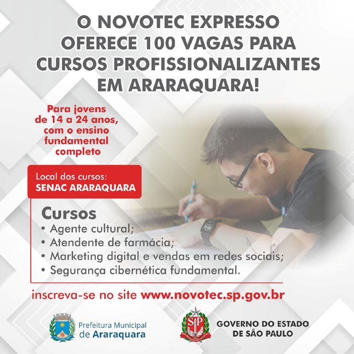 Estão abertas as inscrições para os cursos de qualificação profissional do Novotec Expresso, programa da Secretaria de Desenvolvimento Econômico, Ciência e Tecnologia do Estado de São Paulo que oferta cursos técnicos e profissionalizantes gratuitos, orientação vocacional e oportunidades de estágio para jovens de 14 a 24 anos. Em Araraquara, são quatro cursos que contam com 100 vagas e que serão ministrados no Senac, que fica na Rua João Gurgel, 1935, Carmo.