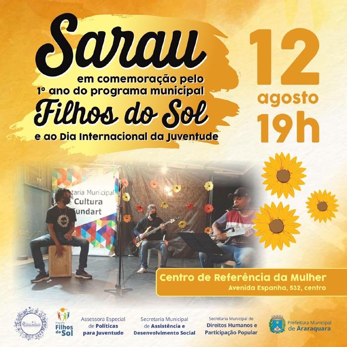 Nesta sexta-feira, 12 de agosto, Dia Internacional da Juventude, será comemorado o primeiro aniversário do programa "Filhos do Sol", programa que visa garantir o direito à renda mínima e a inclusão de adolescentes e jovens em situação de extremo risco pessoal e social. Para celebrar, a Prefeitura de Araraquara promove um sarau que será realizado às 19h no Centro de Referência da Mulher "Heleieth Saffioti", que fica na Avenida Espanha, 532, Centro. A entrada é gratuita para o público.