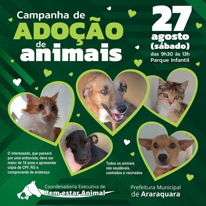 No próximo sábado, 27 de agosto, das 9h30 às 13 horas, será realizada a Campanha de Adoção de Animais no Centro de Adoção Permanente Cão Gabriel, localizado no Parque Infantil. A campanha é realizada pela Prefeitura de Araraquara por meio da Coordenadoria de Bem-Estar Animal da Chefia de Gabinete. Vale salientar que, em caso de chuva, a atividade será cancelada.