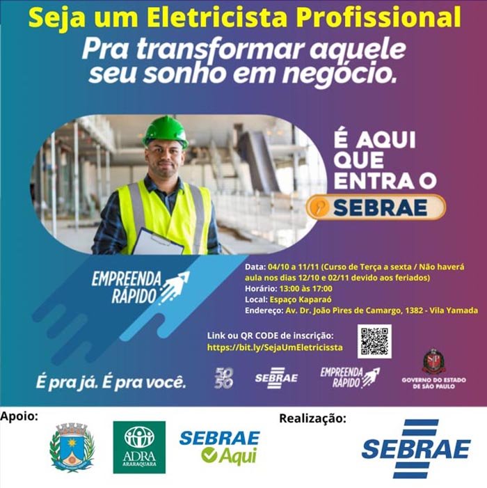 Por fim, o curso “Seja um Eletricista Profissional” é oferecido no período da tarde de 06 de outubro a 30 de novembro, com aulas no Espaço Kaparaó, das 13h às 16h. Inscrições: https://inscricao. sebraesp.com.br/produto/turma/ 22537083 .