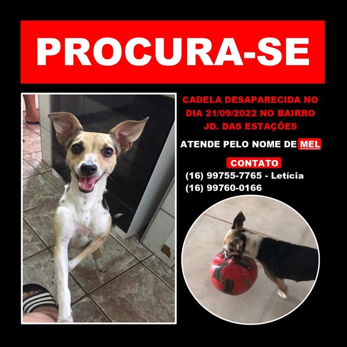 Família do bairro Jardim das Estações em Araraquara está à procura de sua cachorra Mel, que escapou em meio a chuva e trovoadas no dia 21 de setembro de 2022. Apesar das buscas diárias e incessantes pelos bairros próximos, até mesmo nas regiões em que informações de aparições foram relatadas, nos bairros Centro e Carmo, ainda não conseguiram encontrá-la.