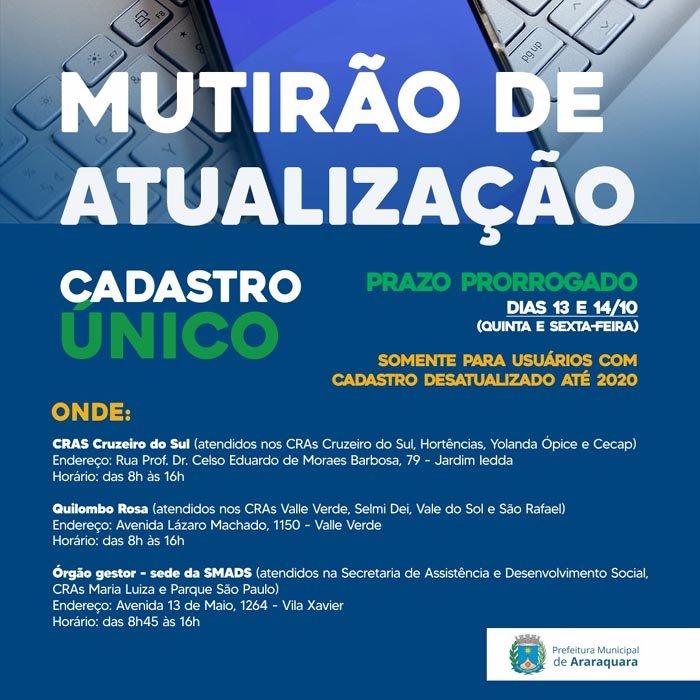 A Prefeitura de Araraquara, por meio da Secretaria Municipal de Assistência e Desenvolvimento Social (SMADS), vai retomar o mutirão de atualização do Cadastro Único nesta quinta-feira, dia 13. O objetivo da ação é atender usuários que estão com cadastro desatualizado até 2020.
