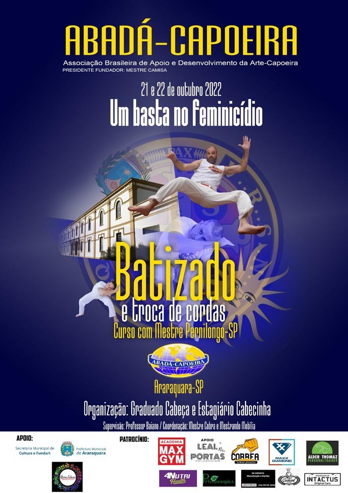 A Abadá Capoeira – Associação Brasileira de Apoio e Desenvolvimento da Arte Capoeira, com o apoio da Secretaria Municipal da Cultura por meio do programa Oficinas Culturais Municipais, realiza o “2º Festival de Capoeira – um basta para o feminicídio” nos dias 21 e 22 de outubro. As atividades são gratuitas.