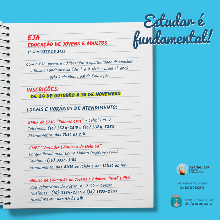 Estão abertas pela Secretaria Municipal da Educação, desde segunda-feira (24), as inscrições para o 1º semestre da EJA (Educação de Jovens e Adultos). As vagas são para o ensino fundamental (da 1ª até a 8ª série, atual 9º ano), para pessoas acima de 15 anos, e o início das aulas para os novos alunos está previsto para 1º de fevereiro de 2023.