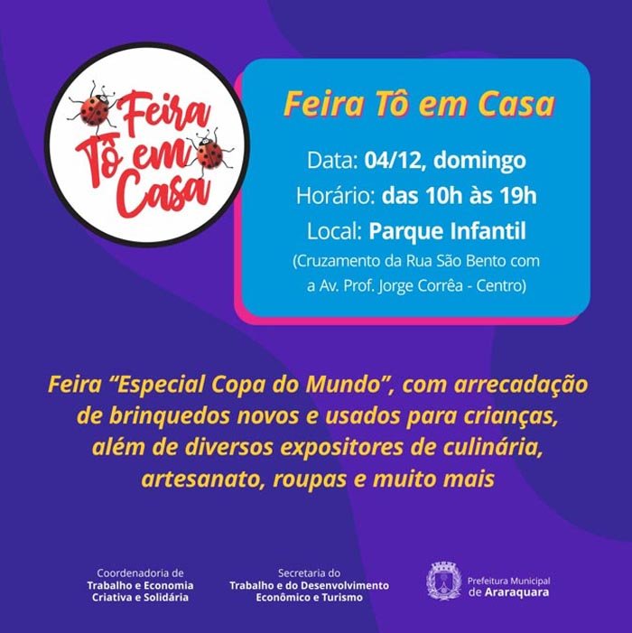 A Feira Tô em Casa conta com o apoio da Prefeitura de Araraquara, por meio da Secretaria do Trabalho, Desenvolvimento Econômico e Turismo e Gerência de Economia Criativa e Solidária, e tem entrada gratuita, aberta a todos os interessados.