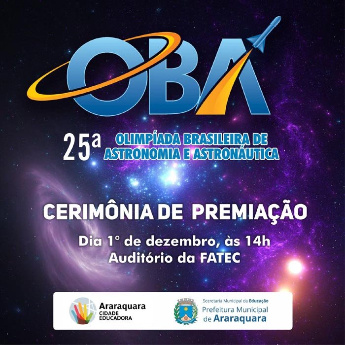 A Prefeitura Municipal de Araraquara, por meio da Secretaria Municipal da Educação, realiza nesta quinta-feira, 1º de dezembro, a cerimônia de premiação dos alunos que se destacaram na Olimpíada Brasileira de Astronomia e Astronáutica (OBA). A solenidade está marcada para as 14h no auditório da Fatec (Rua Precide Scarpino Martim, 126, Jardim Santa Clara) e é aberta aos familiares dos alunos.