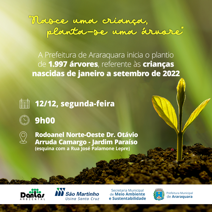 A Prefeitura de Araraquara lança na próxima segunda-feira (12), às 9h, a 3ª fase do projeto “Nasce uma criança, planta-se uma árvore”, com o plantio de 1.997 mudas de árvores, entre nativas e frutíferas, no Rodoanel Norte-Oeste Dr. Otávio Arruda Camargo (esquina com a Rua José Palamone Lepre) - Jardim Paraíso. A ação será realizada pela Secretaria Municipal de Meio Ambiente e Sustentabilidade em parceria com as empresas Dantas Ambiental e a São Martinho (Usina Santa Cruz).