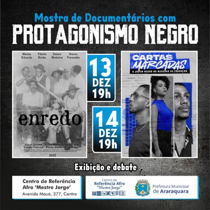 O Centro de Referência Afro "Mestre Jorge" realiza nesta semana a "Mostra de Documentários com Protagonismo Negro", que contará com exibição e debate em torno de duas obras brasileiras. Nesta terça-feira (13), às 19h, será exibido o documentário "Enredo" e no dia seguinte, quarta-feira (14), no mesmo horário, a atração será "Cartas Marcadas".