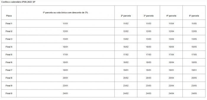 O calendário do pagamento do IPVA (Imposto sobre a Propriedade de Veículos Automotores) 2023 de São Paulo foi divulgado pelo governo estadual. Para o próximo ano, o tributo pode ser pago em quota única com vencimento no mês de janeiro (desconto de 3%) ou parcelado em até cinco vezes, a depender do valor do tributo. Para garantir o desconto, os proprietários dos veículos precisam quitar a taxa integralmente até a data limite da primeira parcela.