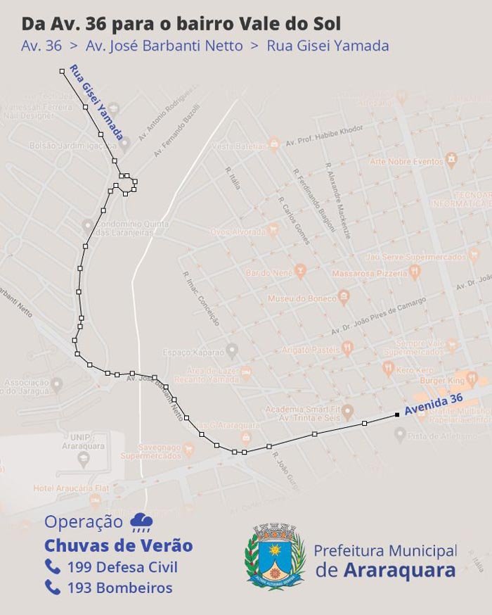 A Prefeitura de Araraquara, por meio das secretarias municipais dos Assuntos de Cooperação de segurança Pública e do Trânsito, Transportes e Mobilidade Urbana, informa que, devido à cratera aberta na Avenida 36 pelas fortes chuvas que atingiram a cidade na última quarta-feira (29) e a necessidade de interdição do tráfego de veículos no local, foram traçados desvios naquela região para possibilitar o acesso ao bairro Vale do Sol, ao Shopping Jaraguá e também para quem chega na cidade pela rodovia Washington Luiz.