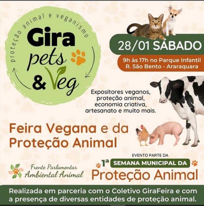 Neste sábado (28), no Parque Infantil, será realizada a Gira Pets & Veg – uma feira vegana da Proteção Animal, realizada em parceria com o Coletivo GiraFeira e com a presença de diversas entidades de proteção animal. A feira será realizada das 9h às 17 horas e terá uma campanha de adoção de animais, realizada pela Coordenadoria do Bem-Estar Animal Araraquara.