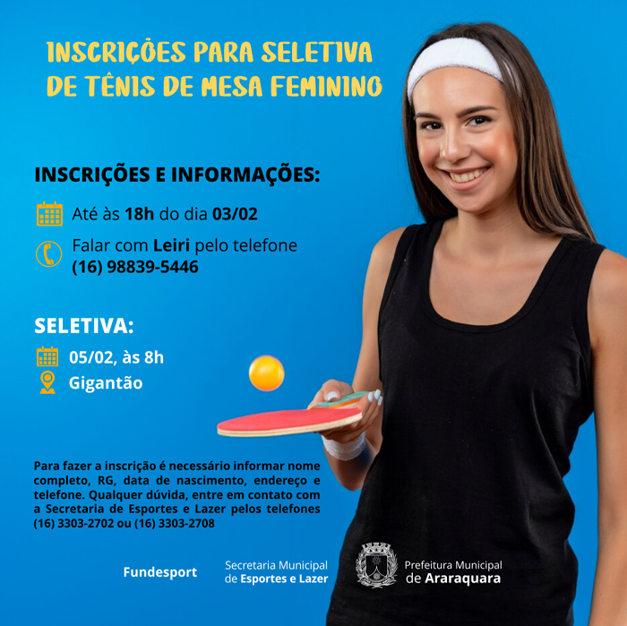 A Secretaria Municipal de Esportes e Lazer e a Fundesport realizarão neste próximo domingo, dia 5 de fevereiro, a seletiva do tênis de mesa feminino, que visa agregar novas atletas para a equipe de alto rendimento em Araraquara.