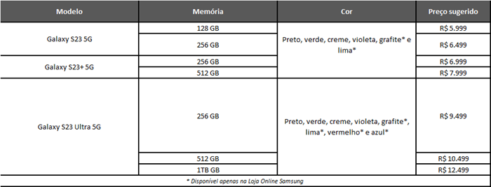 A linha Galaxy S23 5G está disponível em quatro cores27: preto, verde, creme e violeta. Há ainda cores especiais disponíveis apenas para compras realizadas na Loja Online Samsung: grafite e lima para toda a linha S23 5G, além de vermelho e azul, disponíveis exclusivamente para o Galaxy S23 Ultra 5G.