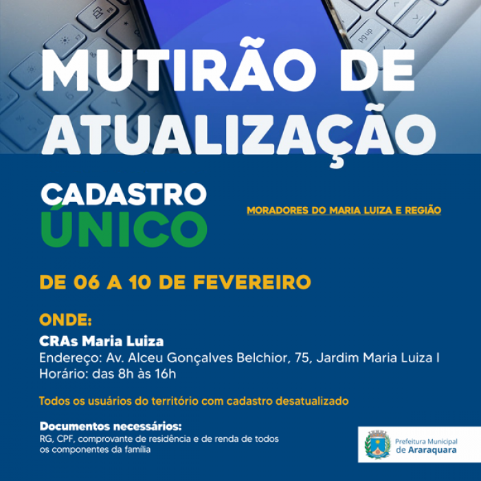 A Prefeitura de Araraquara, por meio da Secretaria Municipal de Assistência e Desenvolvimento Social (SMADS), está realizando, de 06 a 10 de fevereiro, mutirão de atualização do Cadastro Único em dois pontos: nos CRAS do Maria Luiza e Vale do Sol, para atender os moradores inscritos do bairro e região, para atendimento do inscritos no CADÚnico.