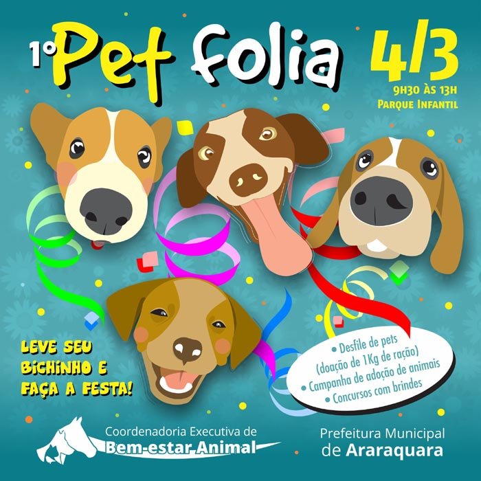 A Prefeitura de Araraquara, por meio da Coordenadoria de Bem-estar Animal, prepara a realização da primeira edição do "Pet Folia", um encontro que visa promover a diversão e interação para tutores e seus bichinhos de estimação e ao mesmo tempo estimular a adoção responsável dos animais que se encontram disponíveis nos abrigos do município. O evento está marcado para o dia 4 de março, um sábado, das 9h30 às 13 horas, no Centro de Adoção Permanente Cão Gabriel, localizado no Parque Infantil.