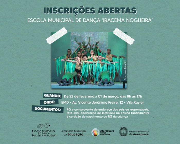 Na próxima quarta-feira, 22 de fevereiro, serão abertas as inscrições para a Escola Municipal de Dança Iracema Nogueira de Araraquara para o ano letivo de 2023. O curso oferecido pela Prefeitura de Araraquara, por meio da Secretaria Municipal da Educação, é totalmente gratuito.