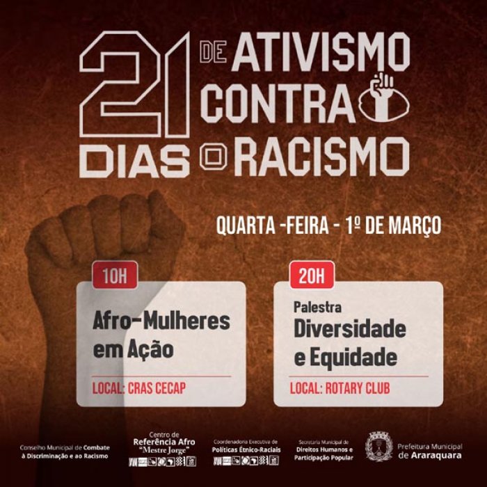 Araraquara será uma das cidades que seguirão o calendário nacional dos "21 Dias de Ativismo contra o Racismo", campanha que existe desde 2017 e funciona como uma grande agenda antirracista, onde movimentos sociais, coletivos, figuras públicas e pessoas independentes podem propor diversas atividades que pautem o debate pelo fim da discriminação racial.