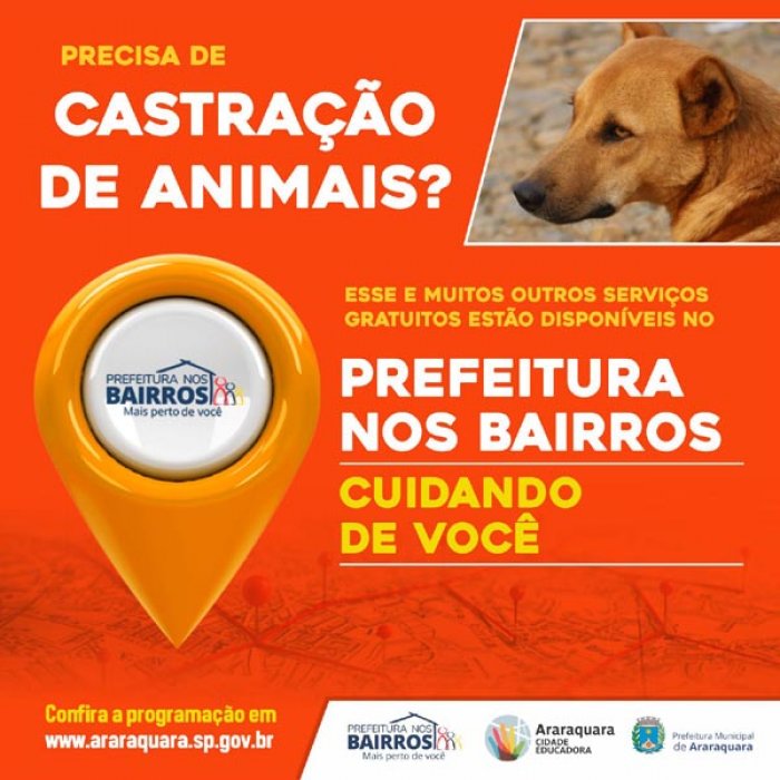 Dentro do "Prefeitura nos Bairros", o cadastro para castração de animais é disponibilizado no atendimento social, que também opera de terça a sexta-feira, das 8h30 às 13h30. Nessa região atendida no momento, o atendimento é oferecido no quiosque ao lado da Unidade de Saúde da Família (USF) Gustavo de Moraes Júnior, também até o dia 17 de março. Para fazer a castração de seu animal, o interessado deve levar cópia de RG, CPF, comprovante de endereço e o comprovante de renda, que deve ser de até três salários mínimos.