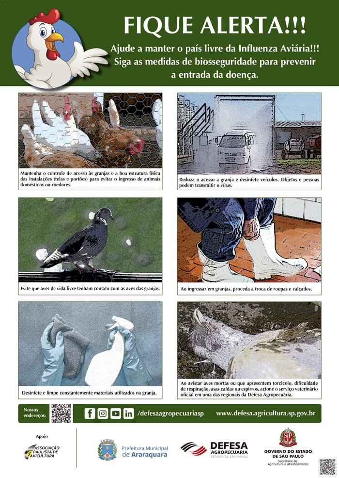 A Prefeitura de Araraquara, por meio da Coordenadoria Executiva da Agricultura, pertencente à Secretaria Municipal do Trabalho, Desenvolvimento Econômico e Turismo, alerta para a importância da prevenção da influenza aviária, também conhecida como gripe aviária, que é considerada uma doença de alto risco para aves quando causada por subtipos de vírus altamente patogênicos.