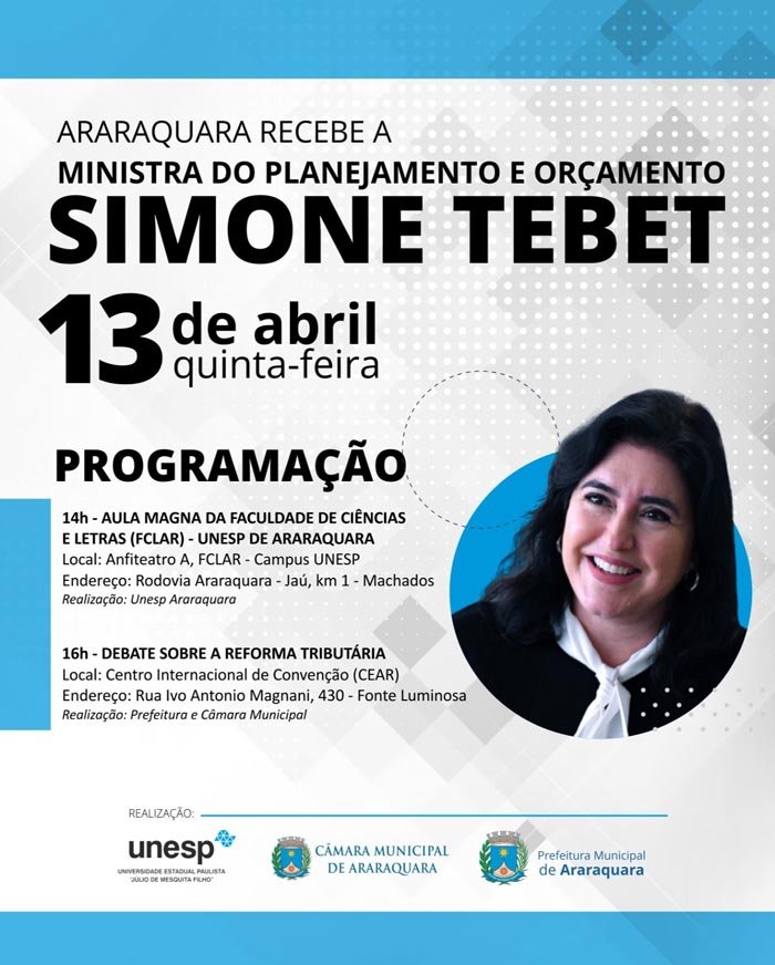 A ministra do Planejamento e Orçamento, Simone Tebet, estará em Araraquara no dia 13 de abril. A agenda na cidade havia sido marcada para o dia 10, mas teve que ser transferida, em virtude da convocação da ministra do Planejamento e Orçamento para a reunião ministerial sobre os 100 dias de Governo Lula que ocorrerá em Brasília, na próxima segunda-feira.