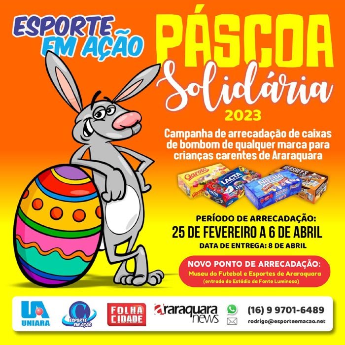A "Páscoa Solidária", campanha que visa arrecadar caixas de bombom de qualquer marca para serem distribuídas a crianças de famílias em situação de vulnerabilidade de Araraquara, se encerra nesta quinta-feira (6). A entrega está marcada para este sábado, 8 de abril, véspera da Páscoa.