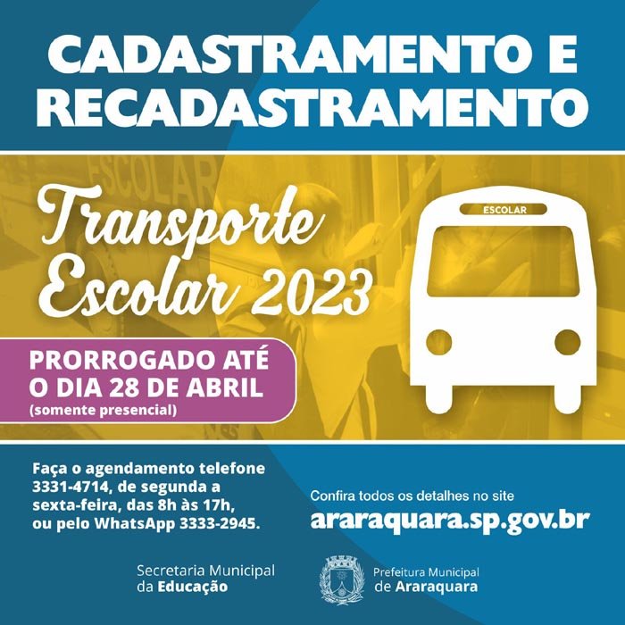 A Prefeitura de Araraquara, por meio da Secretaria Municipal da Educação, anunciou uma nova prorrogação do prazo para o cadastro do transporte escolar para estudantes da rede pública aptos ao uso de transporte escolar no ano letivo de 2023. As inscrições tiveram início no dia 16 de janeiro e seriam encerradas em 31 de março, depois o prazo foi estendido até 20 de abril e agora poderá ser feito até o dia 28 de abril, sexta-feira da próxima semana. A mudança se deu por conta do grande aumento de demanda. Vale destacar que a carteirinha passará a ser exigida a partir do dia 2 de maio, uma terça-feira.