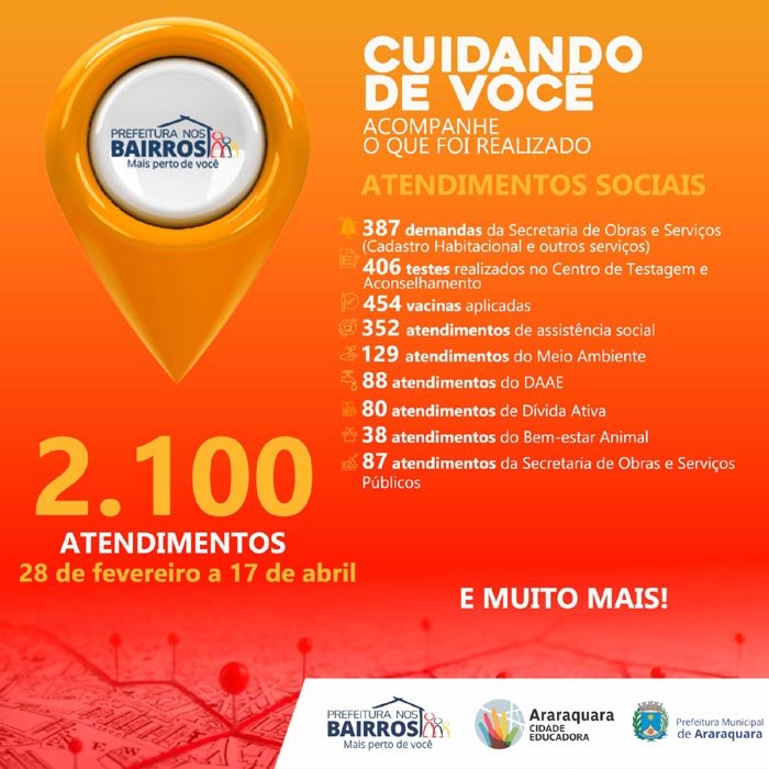 No atendimento social, foram executados um total de 387 atendimentos da Secretaria de Desenvolvimento Urbano (cadastro habitacional e outros serviços); 454 vacinas aplicadas pela Secretaria de Saúde; 406 testes realizados pelo Centro de Testagem e Aconselhamento (CTA) da Secretaria de Saúde; 352 atendimentos da Secretaria de Assistência e Desenvolvimento Social (proteção básica e CadÚnico); 129 demandas da Secretaria de Meio Ambiente e Sustentabilidade; 88 atendimentos do DAAE; 87 atendimentos da Secretaria de Obras e Serviços Públicos; 80 atendimentos do Departamento de Dívida Ativa; 38 da Coordenadoria de Bem-estar Animal; 24 demandas gerais da Secretaria de Saúde; 24 atendimentos da Secretaria de Trabalho e Desenvolvimento Econômico e Turismo; 4 atendimentos da Secretaria de Cooperação dos Assuntos de Segurança Pública; 3 atendimentos da Secretaria de Cultura (uma inscrição em Oficinas Culturais e 2 relacionadas a demandas gerais); 2 atendimentos da Secretaria de Esportes e Lazer; 2 atendimentos da Secretaria da Educação; totalizando 2.100 atendimentos sociais.