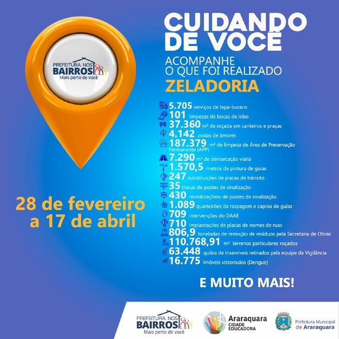 Desde seu lançamento no dia 28 de fevereiro, a edição 2023 do "Prefeitura nos Bairros" soma 5.705 serviços de tapa-buraco (mais 2.096 realizados pelas equipes volantes no mesmo período do Prefeitura nos Bairros, totalizando 7.801 na cidade); 101 limpezas de bocas de lobo; 806,9 toneladas de remoção de resíduos pela Secretaria de Obras; 1.089 quarteirões de raspagem e capina de guias no Prefeitura nos Bairros (mais 245 quarteirões de raspagem e capina de guias na região central pelas equipes volantes no mês de março); 145 terrenos particulares roçados (total de 110.768,91 m²); 37.360 metros quadrados de roçada em canteiros e praças; 187.379 metros quadrados de limpeza de Área de Preservação Permanente (APP); 10 limpezas de áreas próprias (postos de saúde, CRAS, áreas de lazer, etc); 167 remoções de árvores (mais 14 realizadas pelas equipes volantes no mesmo período, totalizando 181); 4.142 podas de árvores (mais 277 realizadas pelas equipes volantes no mesmo período do Prefeitura nos Bairros, totalizando 4.419 na cidade); 76 pulverizações em árvores (mais 20 realizados pelas equipes volantes no mesmo período do Prefeitura nos Bairros, totalizando 96 na cidade); 106 plantios de árvores; 14 aumentos de canteiros; 7.290 metros quadrados de demarcação viária; 1.570,5 metros de pintura de guias; 247 implantações de placas de trânsito; 710 implantações de placas de nomes de ruas; 26 implantações de novas placas de regulamentação; 35 trocas de postes de sinalização; 430 revitalizações de postes de sinalização; 45 instalações de novos postinhos de concreto; 122 endireitamentos de postes de sinalização; 709 intervenções do Daae; 63.448 quilos de inservíveis retirados pela equipe da Vigilância (dengue); e 16.775 imóveis vistoriados pela equipe da Vigilância (dengue).