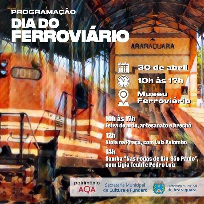 No Museu Ferroviário, das 10 às 17 horas, será realizado o Dia do Ferroviário, com diversas atrações, inclusive feira de artesãos. A programação terá início com a feira de artesãos, um dos destaques na comemoração, levando a participação de artistas da cidade, com produtos diferenciados e ideais para presentear.