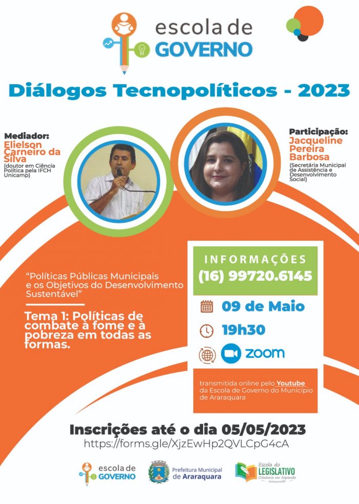 A Escola de Governo do Município de Araraquara (EGMA) está com inscrições abertas, até dia 5 de maio, para o ciclo de debates Diálogos Tecnopolíticos – 2023, cujo tema deste ano será “ Políticas Públicas Municipais e os Objetivos do Desenvolvimento Sustentável”. O evento, que tem o apoio da Escola do Legislativo, será realizado on-line e transmitido ao vivo pelo canal do youtube da EGMA - Escola de Governo, no dia 9 de maio, às 19h30.