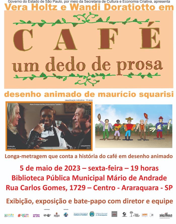 A animação "Café - Um dedo de prosa" terá uma exibição especial e gratuita em Araraquara na próxima sexta-feira, 05 de maio, na Biblioteca Municipal Mário de Andrade. O evento é às 19 horas e vai contar também com uma exposição de desenhos originais do filme, além um bate-papo com o diretor, Maurício Squarisi (Núcleo de Cinema de Animação de Campinas) e parte da equipe de produção do longa-metragem.