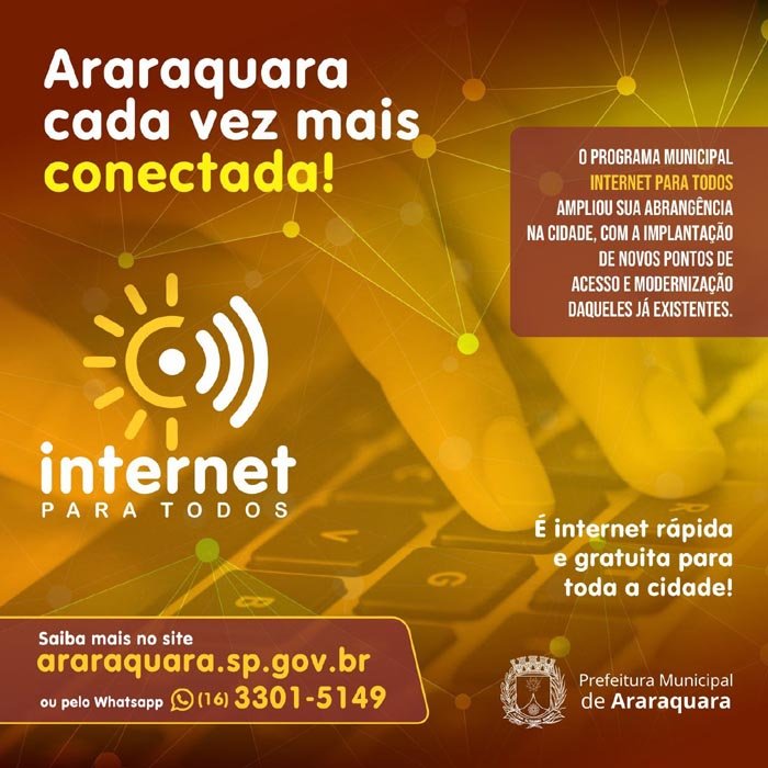 A Prefeitura de Araraquara está ampliando a abrangência do programa municipal "Internet para Todos", que tem o propósito de levar internet gratuita à população. O objetivo é expandir o serviço para mais 20 novos pontos de acesso até meados do ano que vem, além dos 57 já em funcionamento na cidade, e também facilitar o cadastro de munícipes para aumentar o número de usuários em mais bairros e localidades, promover a democratização da informação e a inclusão digital no município.