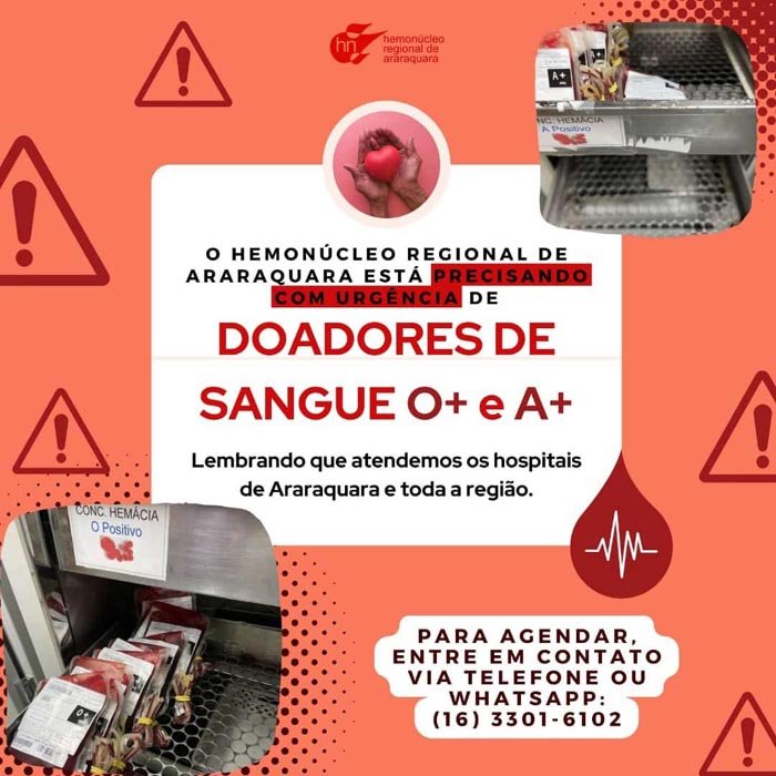 O Hemonúcleo Regional de Araraquara, vinculado à Faculdade de Ciências Farmacêuticas da Unesp, faz uma convocação urgente para doadores de sangue dos tipos O+ e A+, que estão em falta neste momento. Os horários de coleta são de segunda a sexta-feira, das 7h às 12h. Às quintas-feiras, o local atende até as 15h e o horário de funcionamento das sextas-feiras vai até as 13h.