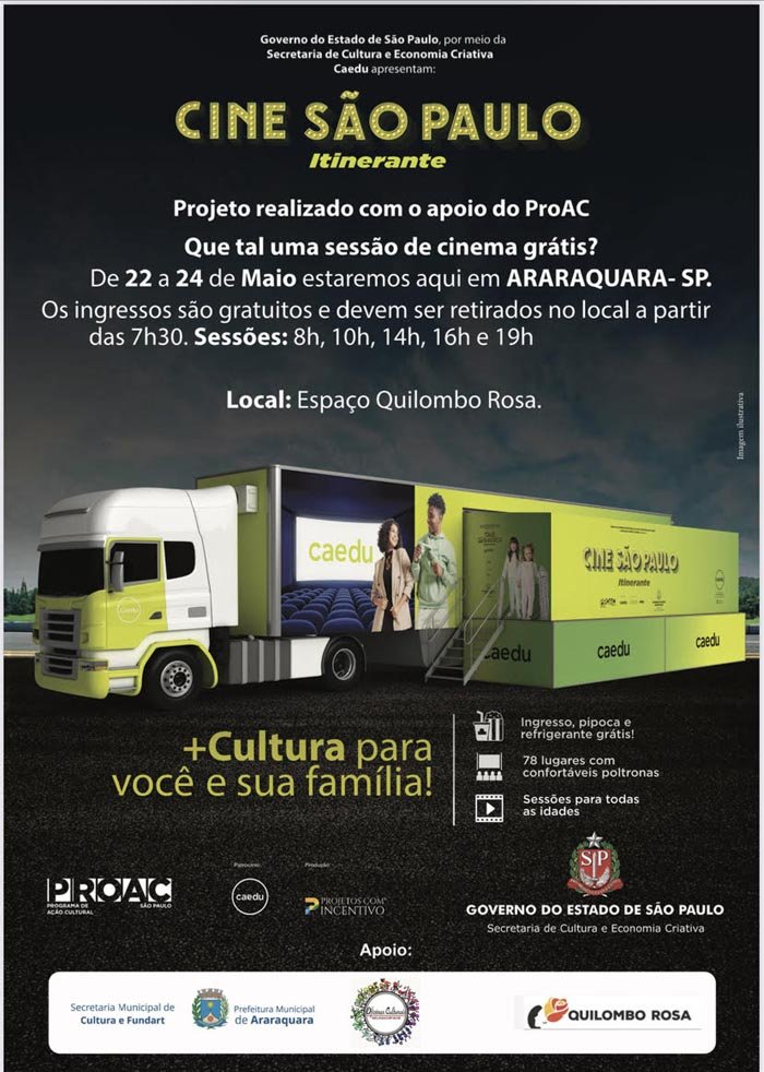 Nos dias 22, 23 e 24 de maio, a população de Araraquara tem um encontro marcado com a diversão. Nessas datas, a cidade recebe o projeto “Cine São Paulo Caedu”, que promoverá sessões gratuitas de cinema para crianças, jovens e adultos.