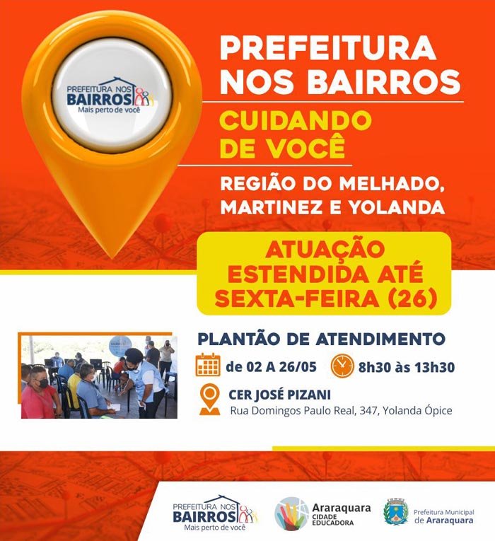 Por conta da alta demanda, a quarta fase da edição 2023 do "Prefeitura nos Bairros", que seria concluída na última sexta-feira (19), acabou estendida até esta sexta-feira (26). Essa etapa do programa atende a região composta pelos bairros Yolanda Ópice, Jardim Martinez, Vila Melhado, Jardim Araraquara, Jardim das Paineiras, Jardim das Palmeiras, Jardim Florença, Jardim Itália, Jardim Palmares, Jardim Paulista, Jardim Portugal, Jardim Santa Júlia III, Jardim Água Branca, Jardim Eliana, Jardim Higienópolis, Jardim Mangiacapra, Jardim Nova Época, Jardim Padre Anchieta, Jardim Santa Rosa, Parque Alvorada, Vila Maria Helena, Vila Normandia, Distrito Industrial I, Jardim Arangá, Jardim Castelo, Jardim das Gaivotas, Jardim Panorama, Jardim São Jorge, Vila Furlan, Vila Guaianazes, Vila Suconasa, Vila Nova, Residencial Antônio Melhado e Residencial Irmãos Laurini.